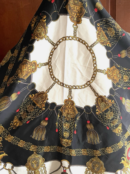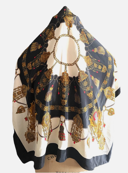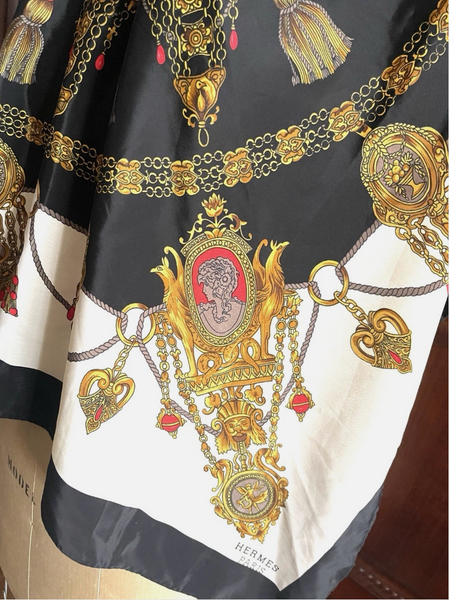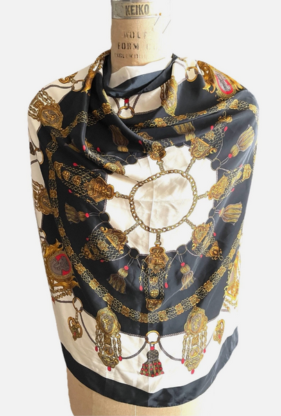 Authentic Vintage HERMES Chain Link Charm Bracelet Print Black 100% Silk Scarf