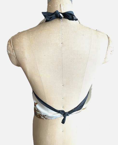 Shown work as various scarf applications and also shown worn as a backless top by tying at neck and waist.
